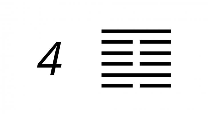 L'i ching 4 interpretazione rappresenta il giovane, l'immaturità, l'inesperienza della vita che può portare a situazioni pericolose. Ma simboleggia anche l'audacia che può portare fortuna quando arriva il momento. Educazione, intuizione, iniziazione, sono compiti che si adattano ai più grandi, nello sviluppo dei più giovani. Includono stimoli per l'insegnamento, che dovrebbero essere elaborati gradualmente, come scalare una montagna.