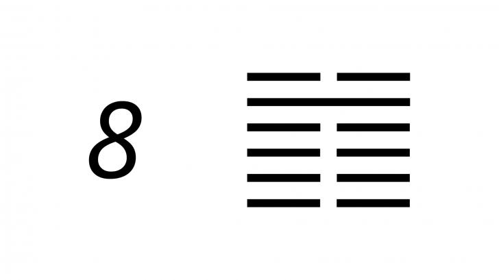 L'energia Yin predomina nell'i ching 8, solcato solo da una linea yang nella sua penultima posizione, simboleggiando il flusso d'acqua sulla terra. Il trigramma della terra inferiore conferisce una quiete e una base solida, che contrasta con il movimento dell'acqua superiore, simboleggiando l'unione tra entrambi gli stati, fisico e liquido, la fusione degli opposti.